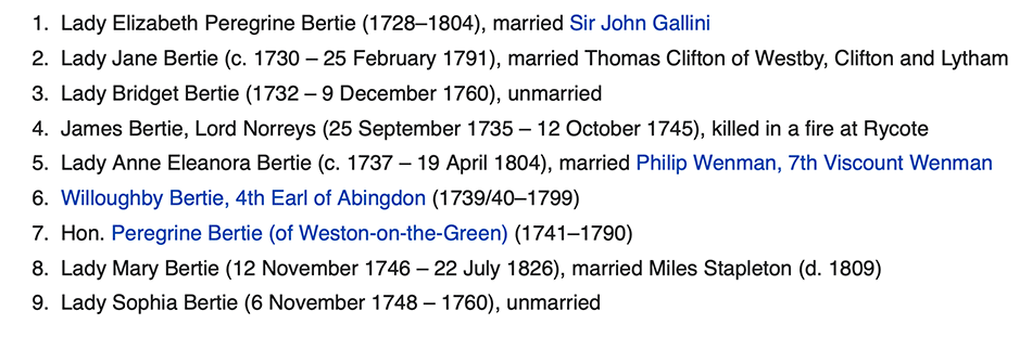 In their thirty-three years of married life Willoughby Bertie and Anna-Maria had nine children. (The chart showing here appeared on Wikipedia in December 2022). It is worthwhile to look into records of this family – what we see is that these children had a hugely significant role in the history of music in England in the eighteenth century. But first, an important event that we need to record is that in 1743, on the death of his uncle without issue, Willoughby Bertie as expected inherited his title and estates, becoming 3rd Earl of Abingdon.   Thereafter he  resided  at the Earl's traditional home, Rycote, near Thame, in Oxfordshire. This was a Tudor-period mansion with typical octagonal towers at the four corners surmounted by onion-shaped roofs of lead or copper, similar to Madingley Hall.[6]