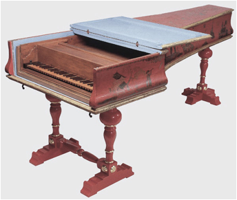 Caption: a Florentine Piano-forte by Bartolomeo Cristofori, dated 1726. The outer case with Chinoiserie ornament on red lacquer is 18th-century work, but the legs are modern replacements. Musikinstrumenten Museum, Leipzig.